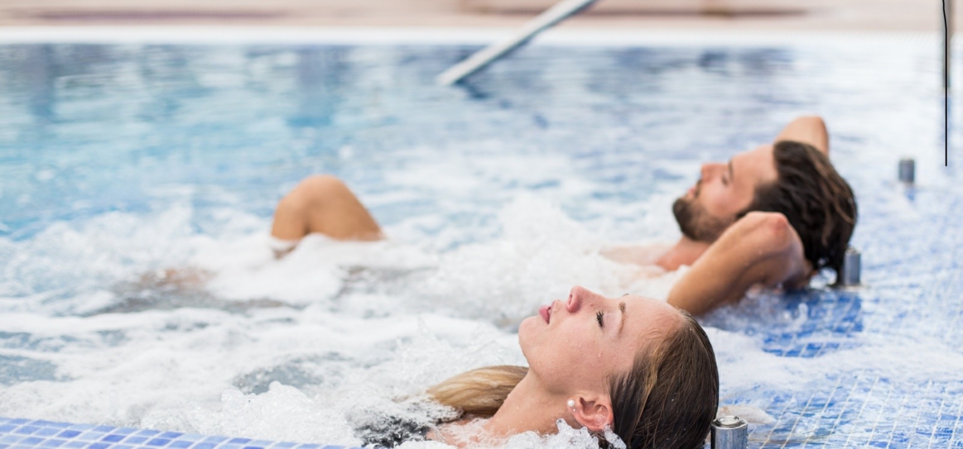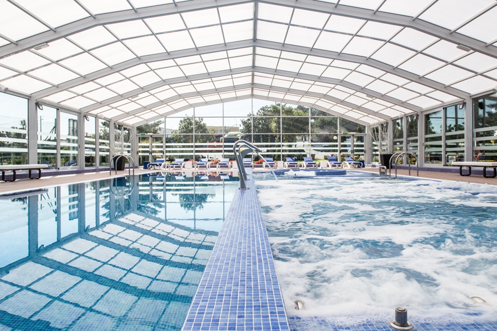 Un espacio de bienestar con dos piscinas, una dinámica y otra de natación, además de jacuzzis, sillones de burbujas, cuellos de cisne y cascadas. Todo ello bajo una cúpula de cristal que baña el recinto con luz natural y lo conecta con el entorno ajardinado.